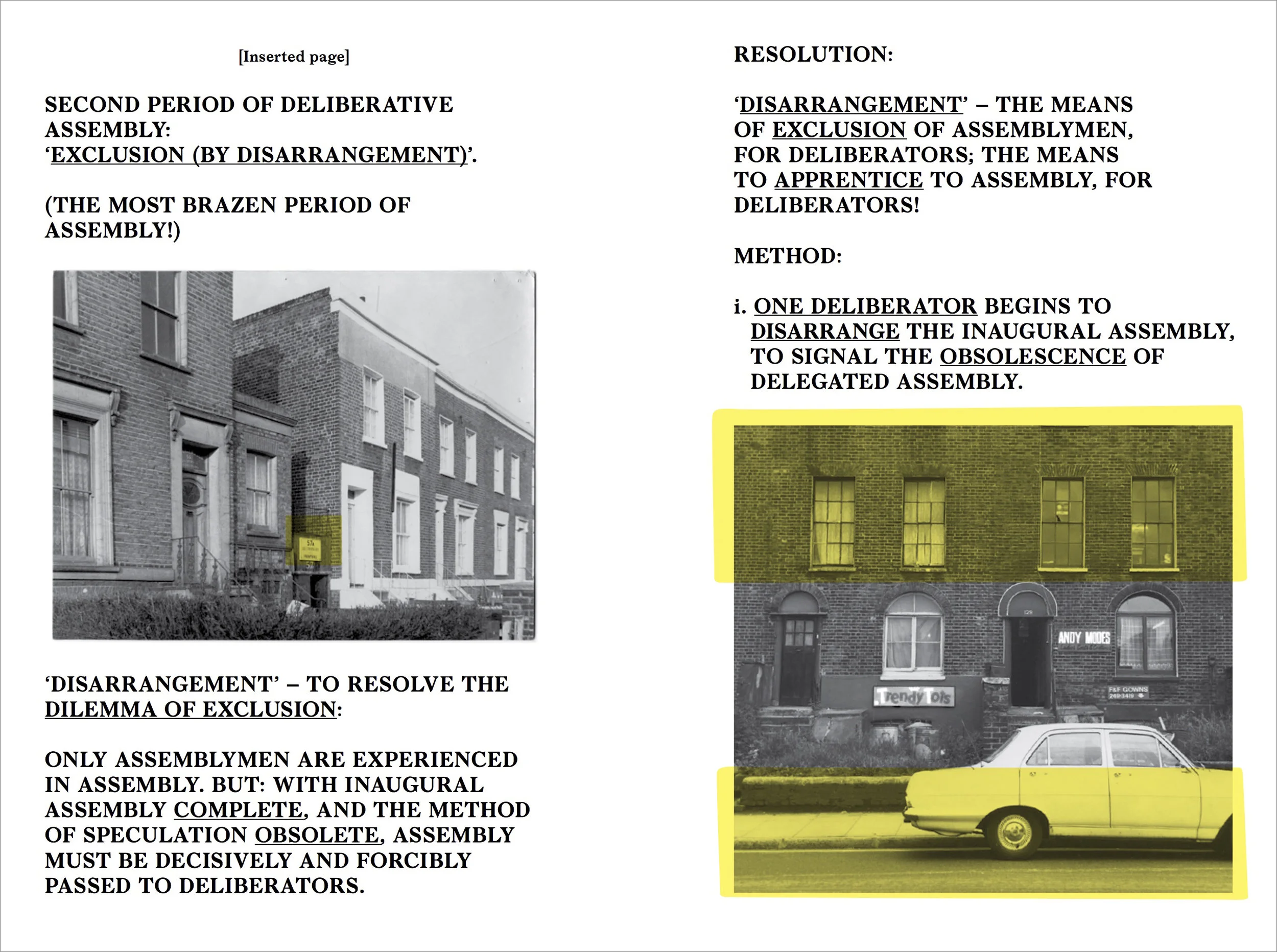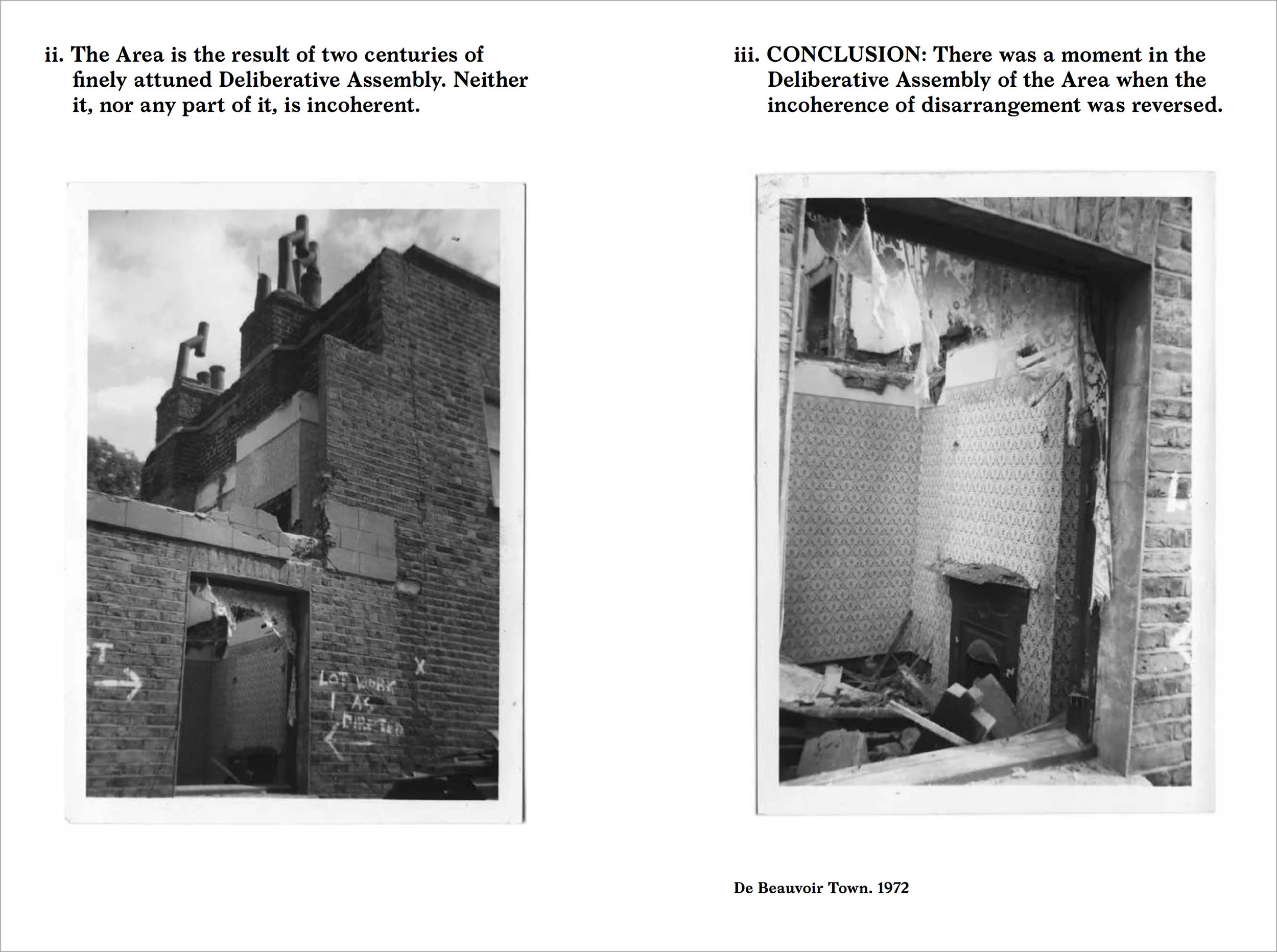 The author has recorded many months of work, following his discovery that the Constitution of the Area has been threatened with Extraction. To secure its future, he must reproduce the Constitution – identical but re-formed, as complete and coherent as the one he knows. To do that, he must recover all the Deliberation that went into its Assembly. The most decisive period was 15 years spanning the 1970s, when people of the Area worked to redirect its future from the one promised, of total demolition.